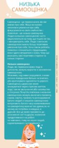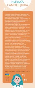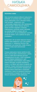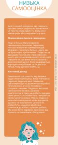 Самооцінка – це переконання, які ми маємо про себе. Якщо ми маємо негативне уявлення про себе, фокусуємося на своїх слабкостях і помилках – це низька самооцінка.