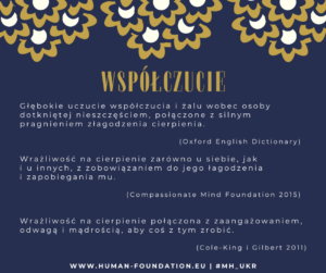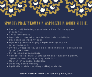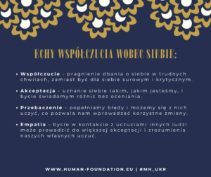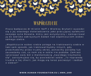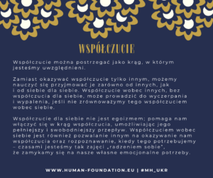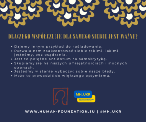 Zamiast okazywać współczucie tylko innym, możemy nauczyć się przyjmować je zarówno od innych, jak i od siebie dla siebie. Współczucie wobec innych, bez współczucia dla siebie, może prowadzić do wyczerpania i wypalenia, jeśli nie zrównoważymy tego współczuciem wobec siebie.